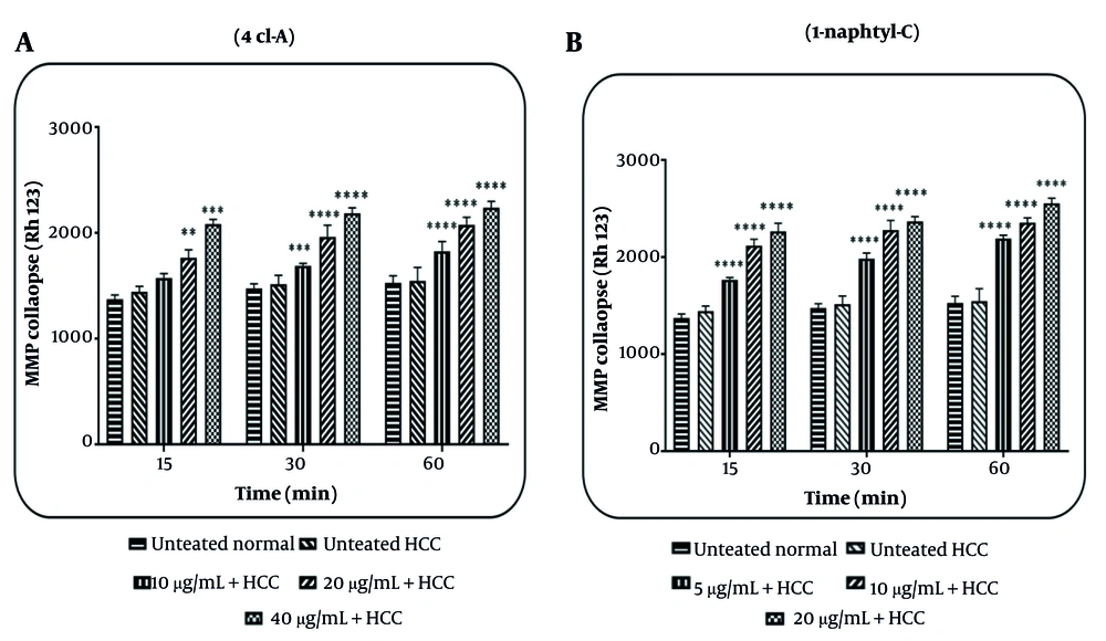 ![Mitochondrial membrane potential (MMP) collapse assay: The effect of A, 4cl-A (10, 20, and 40 µg/mL) and B, 1-naphtyl-C (5, 10, and 20 µg/mL) on MMP collapse [data were represented as mean ± SD; n = 3; ** P < 0.01, *** P < 0.001, and **** P < 0.0001 significant difference with untreated hepatocellular carcinoma (HCC) group]. Mitochondrial membrane potential (MMP) collapse assay: The effect of A, 4cl-A (10, 20, and 40 µg/mL) and B, 1-naphtyl-C (5, 10, and 20 µg/mL) on MMP collapse [data were represented as mean ± SD; n = 3; ** P < 0.01, *** P < 0.001, and **** P < 0.0001 significant difference with untreated hepatocellular carcinoma (HCC) group].](https://services.brieflands.com/cdn/serve/3170d/902836cbbf76e58b0ef73f532ebe66d7c6a70018/ijpr-24-1-164947-i005-preview.webp)