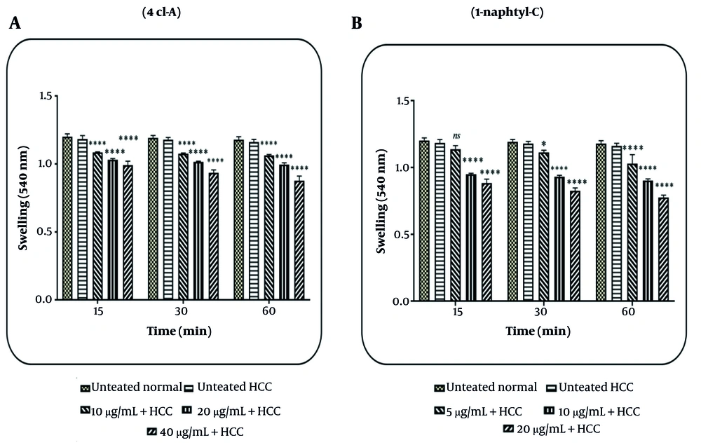 ![Mitochondrial swelling assay: The effect of A, 4cl-A (10, 20, and 40 µg/mL) and B, 1-naphtyl-C (5, 10, and 20 µg/mL) on mitochondrial swelling [data were represented as mean ± SD; n = 3; * P < 0.05, and **** P < 0.0001 significant difference with untreated hepatocellular carcinoma (HCC) group]. Mitochondrial swelling assay: The effect of A, 4cl-A (10, 20, and 40 µg/mL) and B, 1-naphtyl-C (5, 10, and 20 µg/mL) on mitochondrial swelling [data were represented as mean ± SD; n = 3; * P < 0.05, and **** P < 0.0001 significant difference with untreated hepatocellular carcinoma (HCC) group].](https://services.brieflands.com/cdn/serve/3170d/e82f49f626a3c81c21963f8dbd3778044e934ac8/ijpr-24-1-164947-i006-preview.webp)