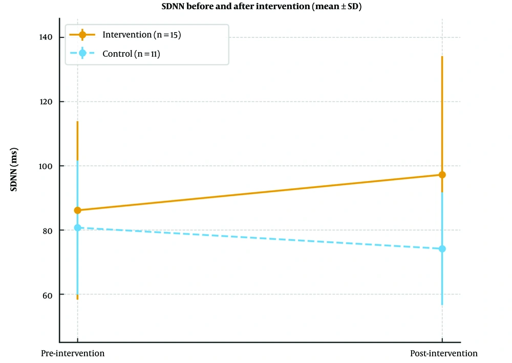 ![Standard deviation of normal-normal beats (SDNN, ms) before and after the intervention in each group [mean ± standard deviation (SD), error bars indicate SDs; intervention: n = 15; control: n = 11]. Standard deviation of normal-normal beats (SDNN, ms) before and after the intervention in each group [mean ± standard deviation (SD), error bars indicate SDs; intervention: n = 15; control: n = 11].](https://services.brieflands.com/cdn/serve/3170f/b3946f74fe4e12aa2dc83271472acc50404c5d3e/ijpr-24-1-165080-i002-preview.webp)