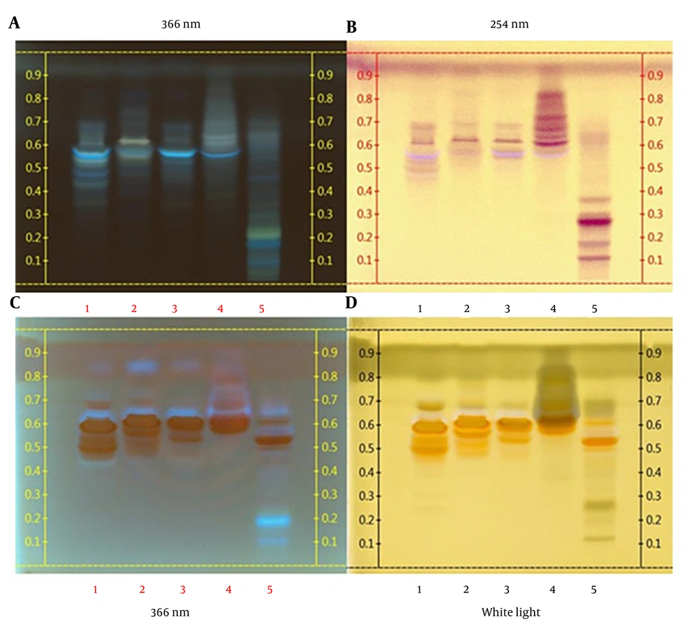 ![High-performance thin-layer chromatography (HPTLC) fingerprint profiles of the methanol extract and fractions of the bulb extracts: A, without derivatization; B, derivatized with vanillin-sulfuric acid; and C and D, derivatized with Dragendorff’s reagent [the tracks correspond to: RK-M1 (1), RK-M2 (2), RK-M3 (3), RK-M4 (4), and crude extract (5)]. High-performance thin-layer chromatography (HPTLC) fingerprint profiles of the methanol extract and fractions of the bulb extracts: A, without derivatization; B, derivatized with vanillin-sulfuric acid; and C and D, derivatized with Dragendorff’s reagent [the tracks correspond to: RK-M1 (1), RK-M2 (2), RK-M3 (3), RK-M4 (4), and crude extract (5)].](https://services.brieflands.com/cdn/serve/3170f/a6f718f52b8b27953c468947b69bde5295fa4096/ijpr-24-1-165081-i001-preview.webp)