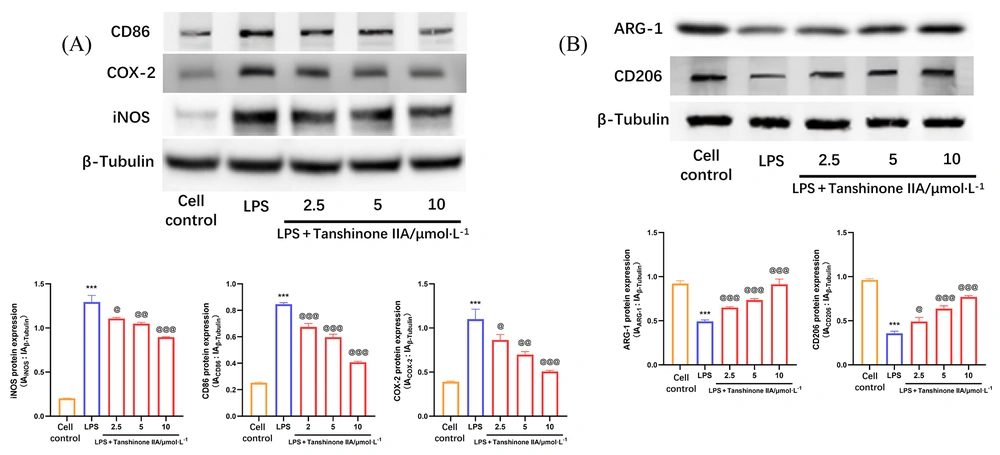 ![Tanshinone IIA regulates the M1/M2 polarization of alveolar macrophages (AMs) induced by lipopolysaccharide (LPS): A, expression of M1 polarization markers [CD86, cyclooxygenase-2 (COX-2), inducible nitric oxide synthase (iNOS)] in LPS-induced AMs; B, expression of M2 polarization markers [CD206, arginase-1 (ARG-1)] in LPS-induced AMs [n = 3; values are presented as mean ± standard deviation (SD); *** P < 0.001 vs. the control group, @ P < 0.05, @@ P < 0.01, and @@@ P < 0.001 vs. LPS-treated group]. Tanshinone IIA regulates the M1/M2 polarization of alveolar macrophages (AMs) induced by lipopolysaccharide (LPS): A, expression of M1 polarization markers [CD86, cyclooxygenase-2 (COX-2), inducible nitric oxide synthase (iNOS)] in LPS-induced AMs; B, expression of M2 polarization markers [CD206, arginase-1 (ARG-1)] in LPS-induced AMs [n = 3; values are presented as mean ± standard deviation (SD); *** P < 0.001 vs. the control group, @ P < 0.05, @@ P < 0.01, and @@@ P < 0.001 vs. LPS-treated group].](https://services.brieflands.com/cdn/serve/3170f/3651c2a3be6aef3908f735fbc0670a93acbf2abe/ijpr-24-1-166272-i004-preview.webp)