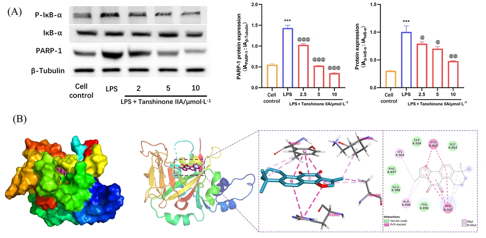 ![Tanshinone IIA regulates the poly (ADP-ribose) polymerase-1 (PARP-1) pathway in alveolar macrophages (AMs) induced by lipopolysaccharide (LPS): A, expression of PARP-1, inhibitor of kappa B-α (IκB-α), and phosphorylated inhibitor of kappa B-α (p-IκB-α) in LPS-induced AMs; B, schematic diagram of molecular docking of tanshinone IIA with PARP-1 [n = 3; values are presented as mean ± standard deviation (SD); *** P < 0.001 vs. the control group, @ P < 0.05, @@ P < 0.01, and @@@ P < 0.001 vs. LPS-treated group]. Tanshinone IIA regulates the poly (ADP-ribose) polymerase-1 (PARP-1) pathway in alveolar macrophages (AMs) induced by lipopolysaccharide (LPS): A, expression of PARP-1, inhibitor of kappa B-α (IκB-α), and phosphorylated inhibitor of kappa B-α (p-IκB-α) in LPS-induced AMs; B, schematic diagram of molecular docking of tanshinone IIA with PARP-1 [n = 3; values are presented as mean ± standard deviation (SD); *** P < 0.001 vs. the control group, @ P < 0.05, @@ P < 0.01, and @@@ P < 0.001 vs. LPS-treated group].](https://services.brieflands.com/cdn/serve/3170f/4950011c838abf2ff552e737c338ccb5f4d34d58/ijpr-24-1-166272-i005-preview.webp)