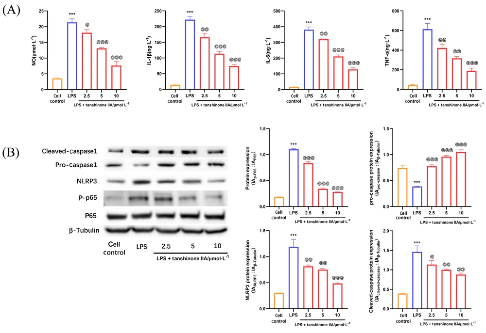 ![Tanshinone IIA inhibits the inflammatory response of alveolar macrophages (AMs) induced by lipopolysaccharide (LPS): A, pro-inflammatory cytokine levels [nitric oxide (NO), tumor necrosis factor-alpha (TNF-α), interleukin-1β (IL-1β), interleukin-6 (IL-6)] in LPS-induced AMs; B, expression of p65, phosphorylated p65 (p-p65), NLRP3, pro-Caspase1, and cleaved Caspase1 in LPS-induced AMs [n = 3; values are presented as mean ± standard deviation (SD); *** P < 0.001 vs. the control group, @ P < 0.05, @@ P < 0.01, and @@@ P < 0.001 vs. LPS-treated group]. Tanshinone IIA inhibits the inflammatory response of alveolar macrophages (AMs) induced by lipopolysaccharide (LPS): A, pro-inflammatory cytokine levels [nitric oxide (NO), tumor necrosis factor-alpha (TNF-α), interleukin-1β (IL-1β), interleukin-6 (IL-6)] in LPS-induced AMs; B, expression of p65, phosphorylated p65 (p-p65), NLRP3, pro-Caspase1, and cleaved Caspase1 in LPS-induced AMs [n = 3; values are presented as mean ± standard deviation (SD); *** P < 0.001 vs. the control group, @ P < 0.05, @@ P < 0.01, and @@@ P < 0.001 vs. LPS-treated group].](https://services.brieflands.com/cdn/serve/3170f/75adf419e9061f7af2e437a602f3cdc4c1361970/ijpr-24-1-166272-i001-preview.webp)