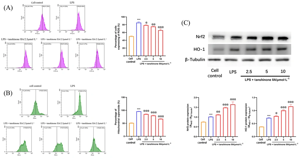 ![Tanshinone IIA inhibits the oxidative damage of alveolar macrophages (AMs) induced by lipopolysaccharide (LPS): A, intracellular reactive oxygen species (ROS) levels; B, mitochondrial MitoSOX content in LPS-induced AMs; C, expression of Nrf2 and heme oxygenase-1 (HO-1) in LPS-induced AMs [n = 3; values are presented as mean ± standard deviation (SD); *** P < 0.001 vs. the control group, @ P < 0.05, @@ P < 0.01, and @@@ P < 0.001 vs. LPS-treated group]. Tanshinone IIA inhibits the oxidative damage of alveolar macrophages (AMs) induced by lipopolysaccharide (LPS): A, intracellular reactive oxygen species (ROS) levels; B, mitochondrial MitoSOX content in LPS-induced AMs; C, expression of Nrf2 and heme oxygenase-1 (HO-1) in LPS-induced AMs [n = 3; values are presented as mean ± standard deviation (SD); *** P < 0.001 vs. the control group, @ P < 0.05, @@ P < 0.01, and @@@ P < 0.001 vs. LPS-treated group].](https://services.brieflands.com/cdn/serve/3170f/84df8c4b079b1d4a4248017b770314bbd7207324/ijpr-24-1-166272-i002-preview.webp)