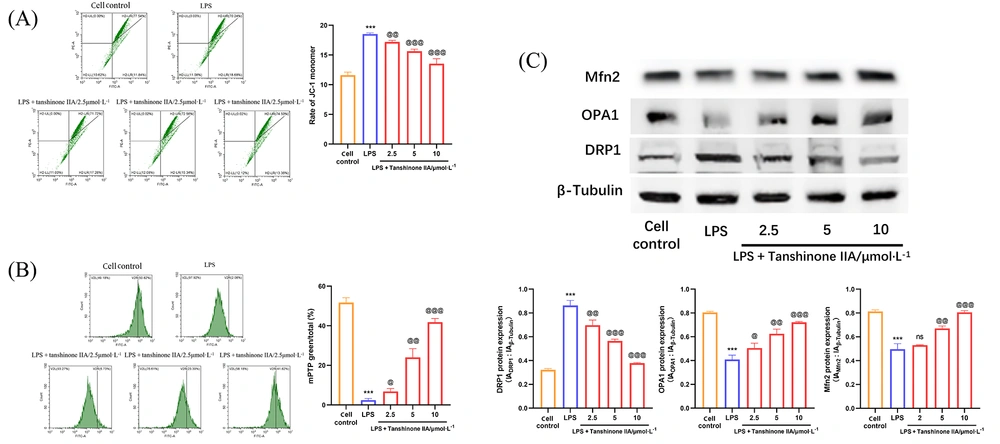 ![Tanshinone IIA inhibits the mitochondrial damage of alveolar macrophages (AMs) induced by lipopolysaccharide (LPS): A, mitochondrial membrane potential levels; B, mitochondrial permeability in LPS-induced AMs; C, expression of dynamin-related protein 1 (DRP1), optic atrophy 1 (OPA1), and mitofusin 2 (Mfn2) in LPS-induced AMs [n = 3; values are presented as mean ± standard deviation (SD); *** P < 0.001 vs. the control group, @ P < 0.05, @@ P < 0.01, and @@@ P < 0.001 vs. LPS-treated group]. Tanshinone IIA inhibits the mitochondrial damage of alveolar macrophages (AMs) induced by lipopolysaccharide (LPS): A, mitochondrial membrane potential levels; B, mitochondrial permeability in LPS-induced AMs; C, expression of dynamin-related protein 1 (DRP1), optic atrophy 1 (OPA1), and mitofusin 2 (Mfn2) in LPS-induced AMs [n = 3; values are presented as mean ± standard deviation (SD); *** P < 0.001 vs. the control group, @ P < 0.05, @@ P < 0.01, and @@@ P < 0.001 vs. LPS-treated group].](https://services.brieflands.com/cdn/serve/3170f/fc6192b6ab835f17f87d6f13ba017f88082a5414/ijpr-24-1-166272-i003-preview.webp)