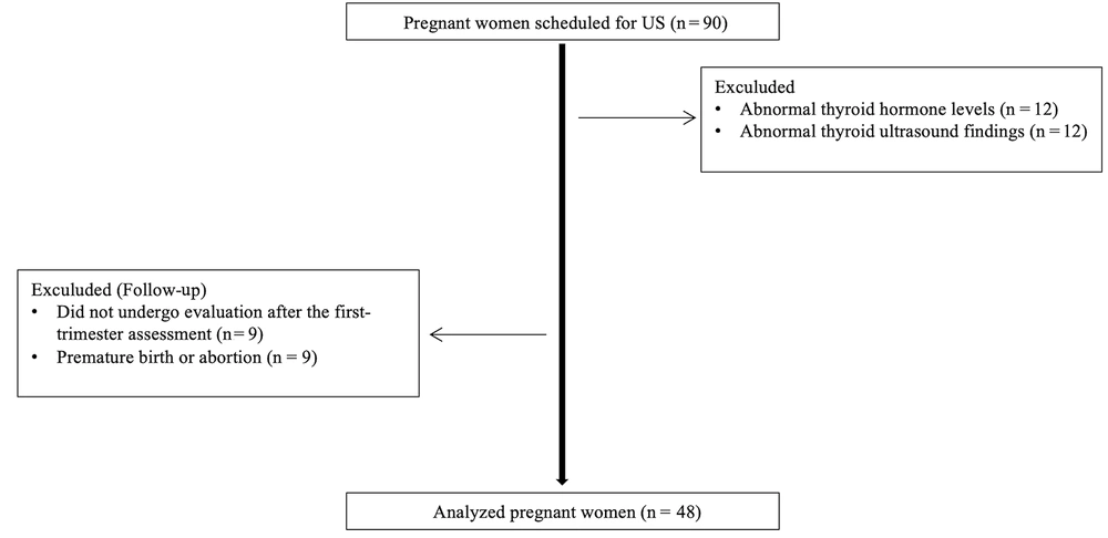 This prospective longitudinal study was conducted among healthy pregnant women who attended the obstetrics and gynecology clinic of our institution between June 2020 and June 2023. Ethical approval was obtained from the institutional review board (70632468-050.01.04/2020/548), and written informed consent was secured from all participants prior to enrollment. At baseline, a total of 90 pregnant women who did not have any comorbidities, especially thyroid disorders, and were not taking thyroid medication were included in the study. In addition to routine antenatal evaluations, thyroid US was performed during the first (11 - 14 weeks), second (21 - 24 weeks), and third (31 - 34 weeks) trimesters. Prior to each sonographic assessment, blood samples were collected to measure serum thyroid-stimulating hormone (TSH), free triiodothyronine (fT3), and free thyroxine (fT4) levels. Thyroid hormone tests taken in the first trimester were routine tests, and after obtaining the necessary approvals, thyroid hormone samples were taken for study in the second and third trimesters. Participants presenting with abnormal thyroid function tests during the first trimester (n = 12) or pathological findings on thyroid US (n = 12) were excluded. Additionally, eight participants were lost to follow-up after the first trimester, and eight pregnancies ended prematurely due to miscarriage or preterm birth. After these exclusions, the study cohort was finalized with the remaining eligible participants. In conclusion, the study comprised 48 healthy pregnant women with normal B-mode US findings and thyroid functions. Pregnant women included in the study did not differ demographically or clinically from the initially excluded group. Each participant was followed up separately in the 1st, 2nd, and 3rd trimesters of pregnancy, and laboratory and US evaluations were performed (Figure 1).