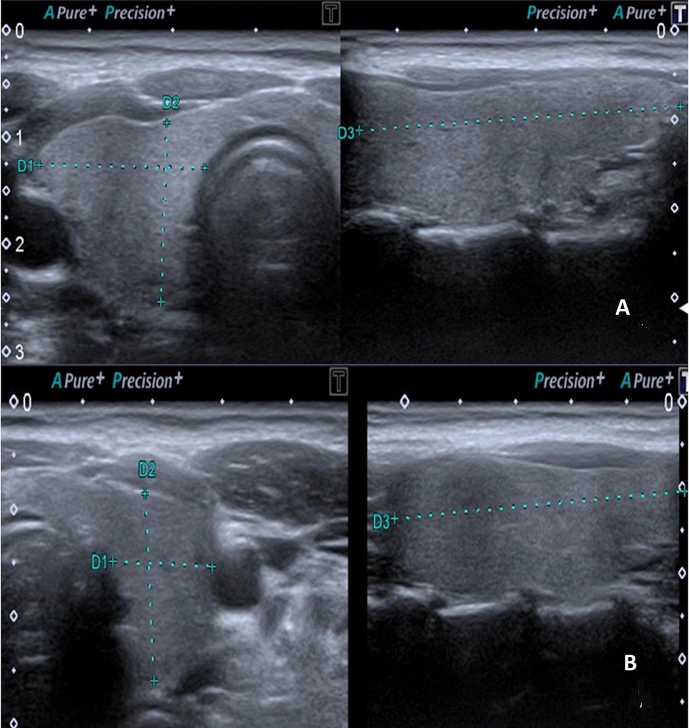 The increased production of thyroxine-binding globulin, transplacental transfer of iodide, and enhanced renal iodide excretion affect both thyroid gland functions and volume during pregnancy (9). Numerous studies have been conducted in regions with varying iodine levels to investigate alterations in thyroid gland size during pregnancy. In the review published by Berghout et al., which encompassed studies involving both iodine-deficient and iodine-sufficient pregnant women, it was observed that thyroid size increased during pregnancy in iodine-deficient regions; however, there was no significant increase in thyroid size in iodine-sufficient regions (3, 10, 11). In the guideline from the American Thyroid Association on thyroid diseases during pregnancy, it was reported that due to the increased thyroid hormone production necessitated by elevated fetal and maternal requirements, a 10% increase in thyroid size can be observed in iodide-sufficient regions, while iodide-deficient areas may experience a more pronounced 20 - 40% increase (12). In the study of Sahin et al., a significant increase was identified in thyroid volume during pregnancy in the region characterized by severe iodine deficiency (13). Fister et al., in their longitudinal prospective study on 118 pregnant women in the iodine-sufficient Slovenian population, reported that thyroid gland sizes increased significantly between the first and third trimesters and decreased in the postpartum period (14). In Elebrashy et al.’s study of the Egyptian women population, although the thyroid gland sizes were higher in pregnant women, no significant difference was found compared to the non-pregnant group (5). In the study of Henrietta et al. on the Nigerian female population, it was reported that thyroid gland sizes increased in pregnant women in iodine-sufficient regions, and this increase was gradual during trimesters (15). In the study by Vannucchi et al. within the mild iodine-insufficiency region, a significant increase in thyroid gland size was reported during pregnancy (16).