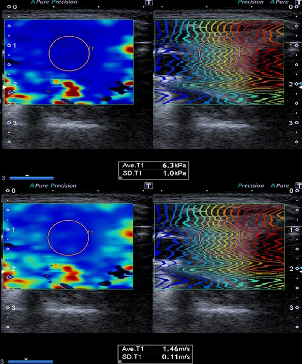 Various studies have presented varying ranges of elasticity (kPa) (9-19) and velocity (m/s) (1.2 - 2) values for the normal thyroid gland using the 2D-SWE method. Mean 2D-SWE values for the healthy control group were reported as 12.49 ± 3.23 kPa and 1.94 ± 0.23 m/s in the study by Kara et al., 10.97 ± 3.1 kPa in the study by Arda et al., and 9.5 ± 3.6 kPa in the study by Herman et al. (7, 27, 28). In our study, we computed the mean 2D-SWE values for all three trimesters among healthy pregnant women who exhibited no thyroid gland pathology on ultrasound and had normal laboratory findings. To our knowledge, no other studies are available in the literature that focus on thyroid gland elastography in pregnant women. Consequently, when compared to measurements from non-pregnant healthy control groups as documented in existing literature, the mean kPa and m/s values observed in our study for all three trimesters were marginally lower but remained within the realm of normal ranges. Furthermore, our study identified a decline in elastography values during the latter stages of pregnancy. As far as we know, decreased thyroid gland stiffness has only been reported in cystinosis cases in the literature. It has been reported that the reason for the decrease in tissue stiffness in these cases may be the loosening of extracellular matrix fibers and adhesions between cells, leading to a decrease in tissue stiffness (29). This situation in our study may be due to the changes mentioned above. Still, it may also be attributed to the fact that the enlargement of the thyroid gland during pregnancy may be associated with an increase in extracellular fluid and blood volume. We believe that with the widespread use of elastography in thyroid imaging, knowing the physiological elastography changes that occur during pregnancy and the normal elastography values for all three trimesters can prevent possible incorrect predictions, especially overdiagnosis, and increase the awareness of radiologists.