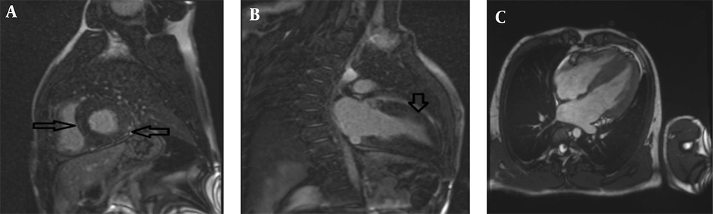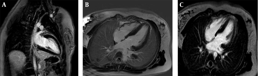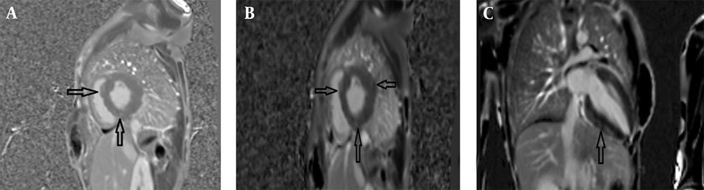 The LGE was assessed using a 2D inversion-recovery gradient-echo sequence acquired 10 - 15 minutes after intravenous administration of gadobutrol (0.15 mmol/kg) at a flow rate of 3 mL/s followed by a 20 mL saline flush. Slice thickness was 8 mm. Inversion time was optimized individually using a Look-Locker sequence to null normal myocardium (13).