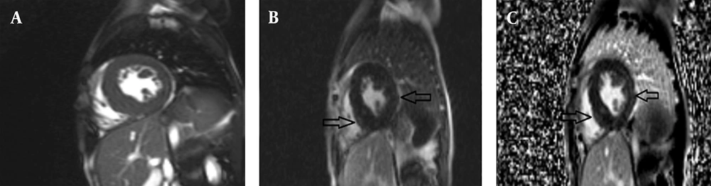 T2 mapping (Myocardial Edema Assessment) was performed using a T2-prepared single-shot SSFP sequence with echo times of 0, 24, and 55 ms in mid-ventricular short-axis and 4-chamber views to detect myocardial edema (18).