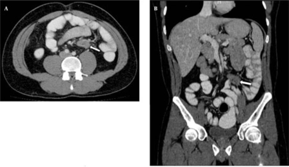 CTE is a relatively new technique which is used generally in patients with Crohn’s disease and other small bowel pathologies (9, 10). The difference between CTE and conventional and CT enteroclysis is that; there is no need for nasojejunal intubation and as a result, there is better patient comfort and less radiation exposure (9, 11). Colectomy is the preferred operation for patients with polyposis syndrome as performed in our patient. Providing luminal distension using routine oral contrast agents is almost impossible in such patients due to the short intestinal transit time. The oral contrast agent which was used for CTE examination was developed for small bowel distension. Thus, the optimal luminal distension could be achieved and the relation of DTs with the small bowel and mesenteric structures could be clearly demonstrated.