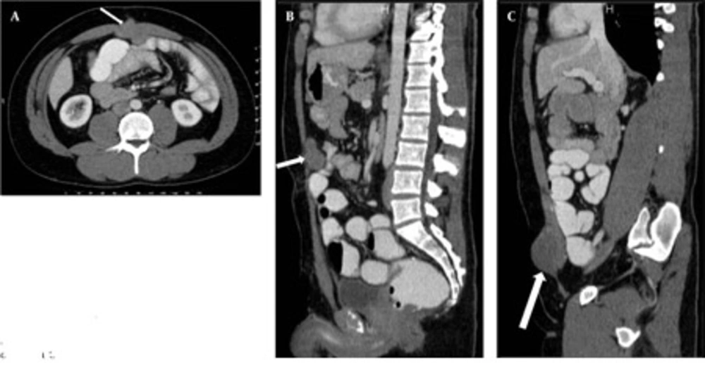 A, Axial cut obtained at the superior level of the umbilicus; B, Reformatted midline sagittal; and C, Right parasagittal CTE images of the patient show anterior abdominal wall desmoid tumors (DTs) (arrows). The relationship between DTs and small bowel loops is clearly seen on the MDCT images.