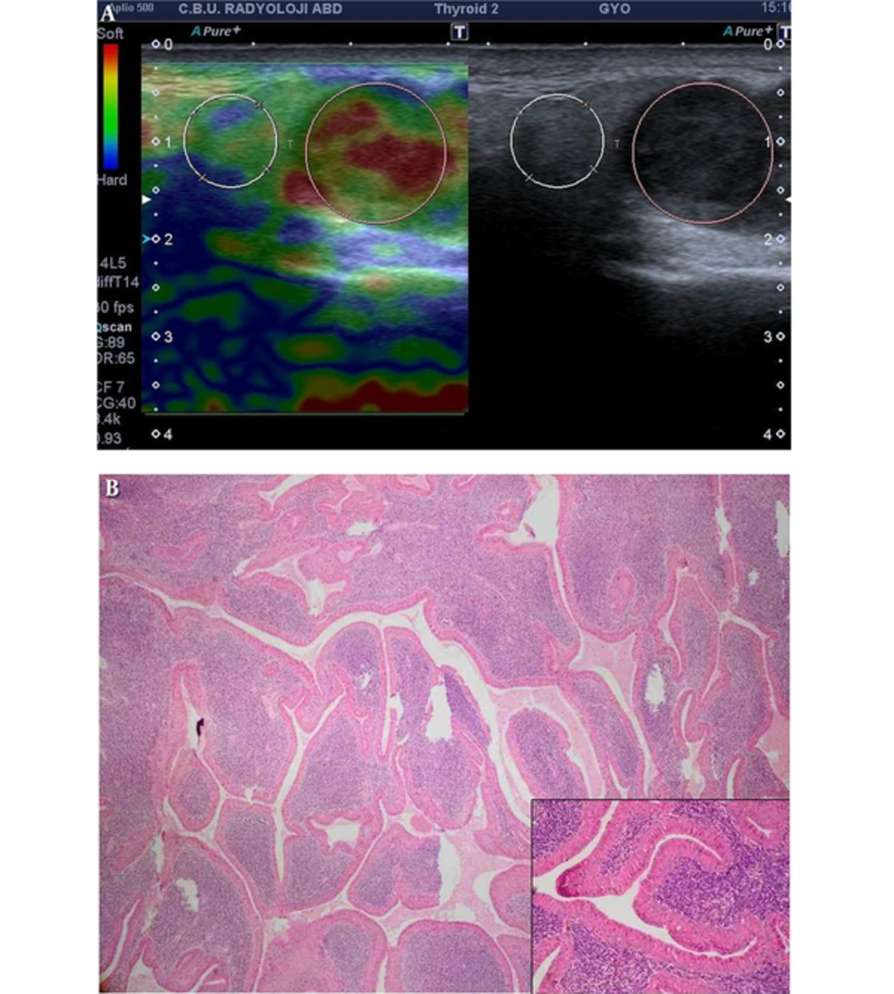 A, Warthin’s tumor: cystic degenerated lobulated hypoechoic solid mass with mixed type vascularization in left parotid gland mass which is predominantly soft. Strain ratio: 0.46, score of 1. B, The tumor is characterized by cystic and papillary appearance with lymphoid proliferation (H&E × 40); inset: papillary projections are lined by oncocytic epithelium which composed of double cell layer (H&E × 200).