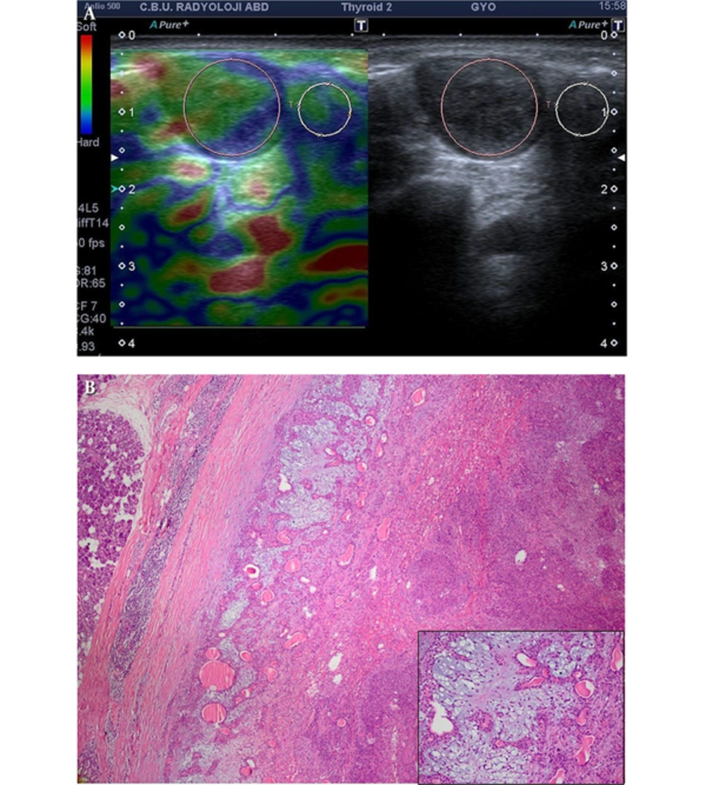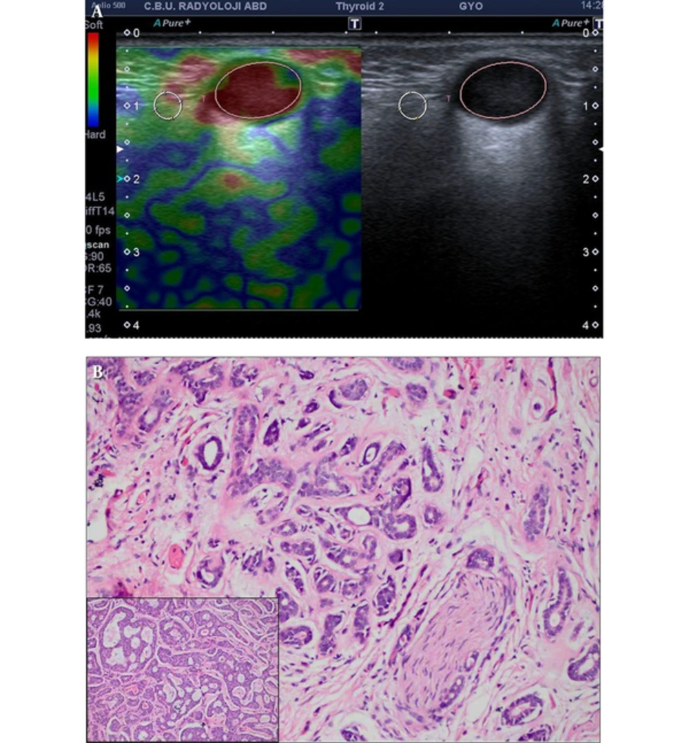 The strain ratios of tumors have been calculated with the mean of 2.26 ± 0.29 in benign tumors, and 2.02 ± 0.59 in malignant tumors (Table 3). There was no statistically significant difference between the two groups (P = 0.698). Elastography score was calculated as mean 2.4 ± 0.94 in benign tumors and mean 2.28 ± 0.38 in malignant tumors. There was no statistically significant difference between the two groups (P = 0.708). Receiver operating characteristic (ROC) analysis demonstrated a strain rate of 0.89 with a sensitivity rate of 71%, and specificity rate of 50%. However, the area under the ROC curve was 0.55, which is not statistically significant (P = 0.699). Elastographic maps according to histologic types of tumors are presented in Figures 1 - 4 and Table 4.