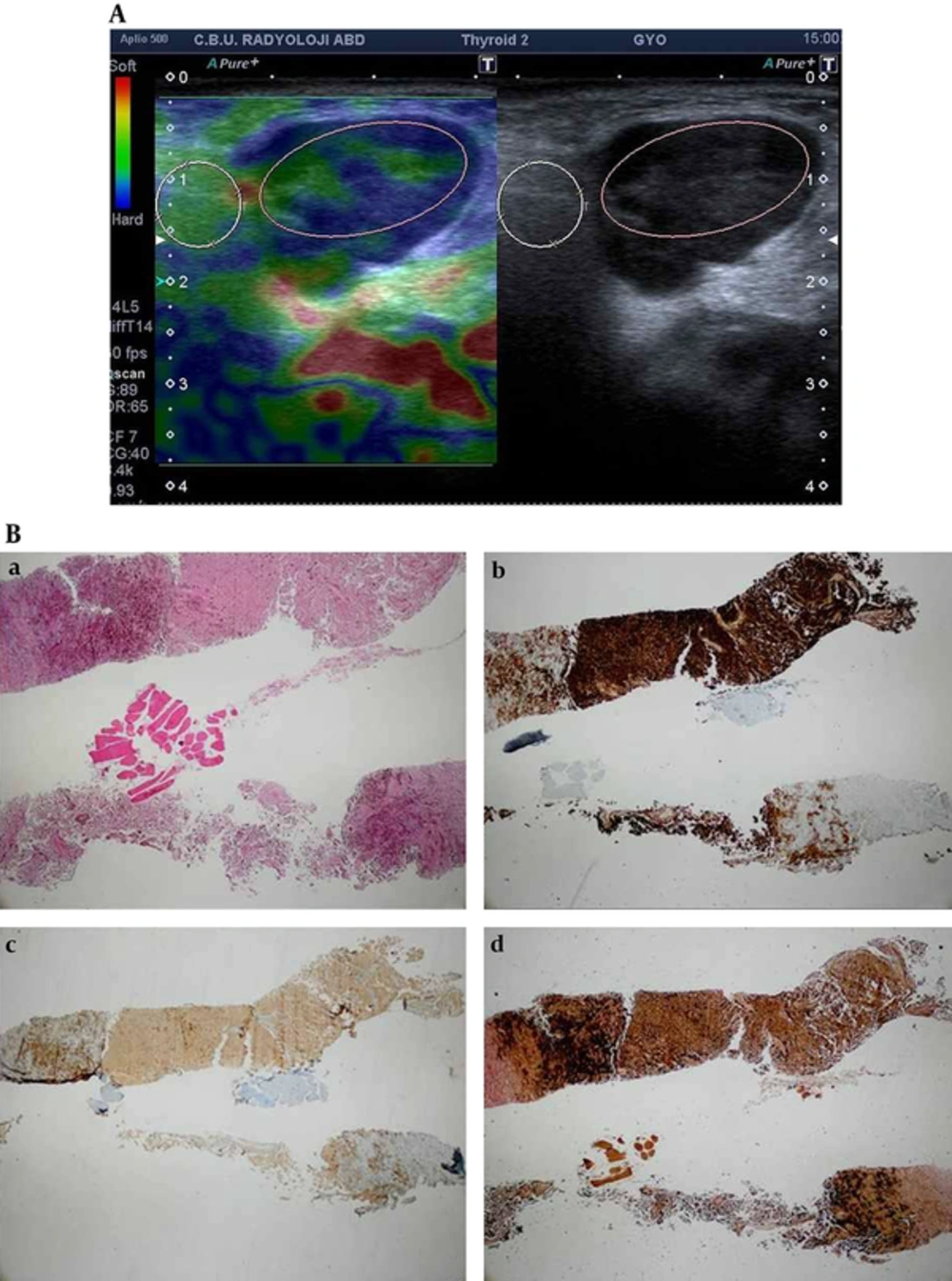 A, Malignant melanoma: well-defined hypoechoic solid mass with mixed type vascularization in right parotid gland mass which stiff (blue) areas represent more than 50% of tumor. Strain ratio: 2.1, score of 3. B, The core biopsy consists of scattered tumor cells staining positivity with HMB-45, Melan-A and Fontana-Masson, B(a), H&E × 40, B(b), HMB-45 × 40, B(c), Melan-A × 40, B(d), Fontana-Masson × 40.