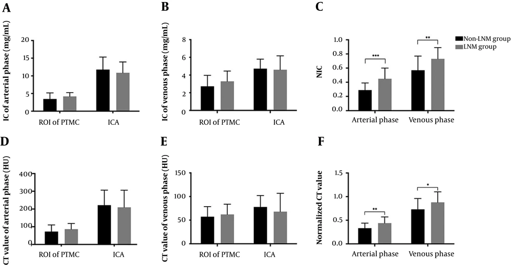 Iodine values and CT values in PTMC for prediction of cervical LNM. A and B, IC of PTMC and ICA in arterial and venous phases; C and F, Comparison between non-LNM group and LNM group in the NICs and normalized CT values. D and E, CT values of PTMC and ICA in arterial and venous phases. Bars mean standard deviation. *, Significance was considered when P < 0.05; **, significance was considered when P < 0.01; ***, significance was considered when P < 0.001. LNM, lymph node metastasis; IC, iodine concentration; ROI, region of interest; ICA, internal carotid artery; NIC, normalized iodine concentration. PTMC, papillary thyroid microcarcinoma.