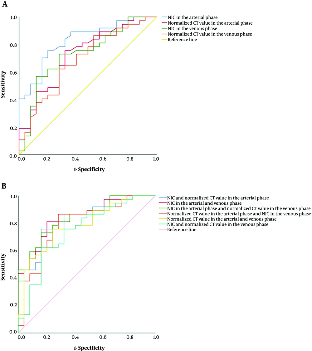 ROC (receiver operating characteristics) curves of iodine values and CT values for the diagnosis of lymph node metastasis (LNM) in patients with papillary thyroid microcarcinoma (PTMC). A, ROC comparison of normalized iodine concentration (NIC) in arterial phase, normalized CT value in arterial phase, NIC in venous phase, normalized CT value in venous phase; and B, Combinations of two parameters in the four significant iodine values and CT values.