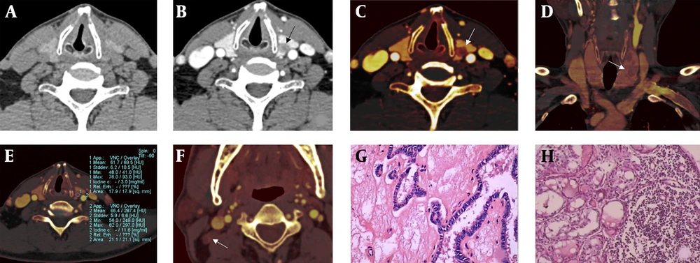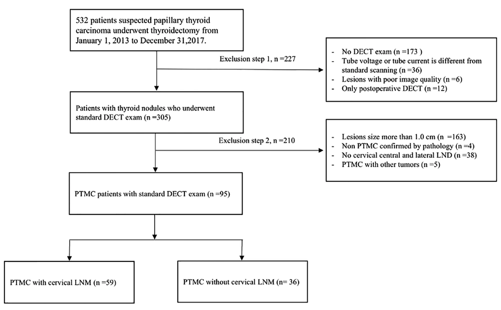 Papillary thyroid carcinoma (PTC) is the most frequently malignant tumor of the thyroid gland. The incidence of PTC has increased rapidly worldwide in the recent years, mainly because of the early detection of papillary thyroid microcarcinoma (PTMC), which is defined as PTC ≤ 1 cm in the greatest dimension (1). PTMC has a relatively good prognosis, with a high survival rate and low recurrence rate. However, the treatment of patients with PTMC is controversial. Studies by Pacini (2) and Zhang et al. (3) showed that PTMC had all the biological characteristics of malignant tumors and the lymph node metastasis (LNM) rate was up to 50% with the main predictors of invasion, recurrence, and distant metastases. The 2015 guidelines of the American Thyroid Association do not recommend cervical lymph node dissection (LND) in PTMC patients without clear evidence of existing LNM (4, 5). At present, whether PTMC patients need thyroidectomy or cervical LND depends on the occurrence of cervical LNM. Some studies have predicted the LNM by clinical and pathologic features, but the results were varied, and further investigation is warranted (3, 6, 7). Ultrasonic examination is significant for the preoperative diagnosis of cervical LNM in PTMC patients; however, it has difficulties and limitations for observing the lymph node at the cervical central region. Several studies have found that dual-energy computed tomography (DECT) is prior to conventional CT in visualizing the morphological edge and internal structure of lesions, and the iodine image obtained from DECT is helpful in differential diagnosis of benign and malignant thyroid nodules (8, 9).
