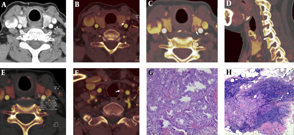 A 52-year-old male papillary thyroid microcarcinoma (PTMC) patient with lateral lymph node metastasis (LNM). The left lobe nodule of the thyroid was found after the health examination. Postoperative pathological results showed that the maximum diameter of the left PTMC with lateral LNM. Dual-energy linear blending image in non-enhanced CT images and arterial phase (A,B). Iodine images (C-F). Compared with the linear blending images, the boundary and internal structure of PTMC were clearer in the iodine image (black and white arrow in B, C). The iodine images show the left thyroid lobe’s multiple noncircular low density lesions (white arrows in C, D). Incomplete thyroid capsule (white arrow in C), multiple lesion (white arrow in D), and normalized iodine concentration (NIC) of PTMC in arterial phase = 0.259 (E). All morphological features and quantitative parameters suggest that the thyroid nodules were malignant, and the cervical LNM potential was high. Image F shows a metastatic lymph node in the right area of the neck (white arrow). Postoperative pathological results showed that the maximum diameter of the left PTC was 7.0 mm (G, H&E staining, ×200) with lateral LNM (H, H&E staining, ×200).