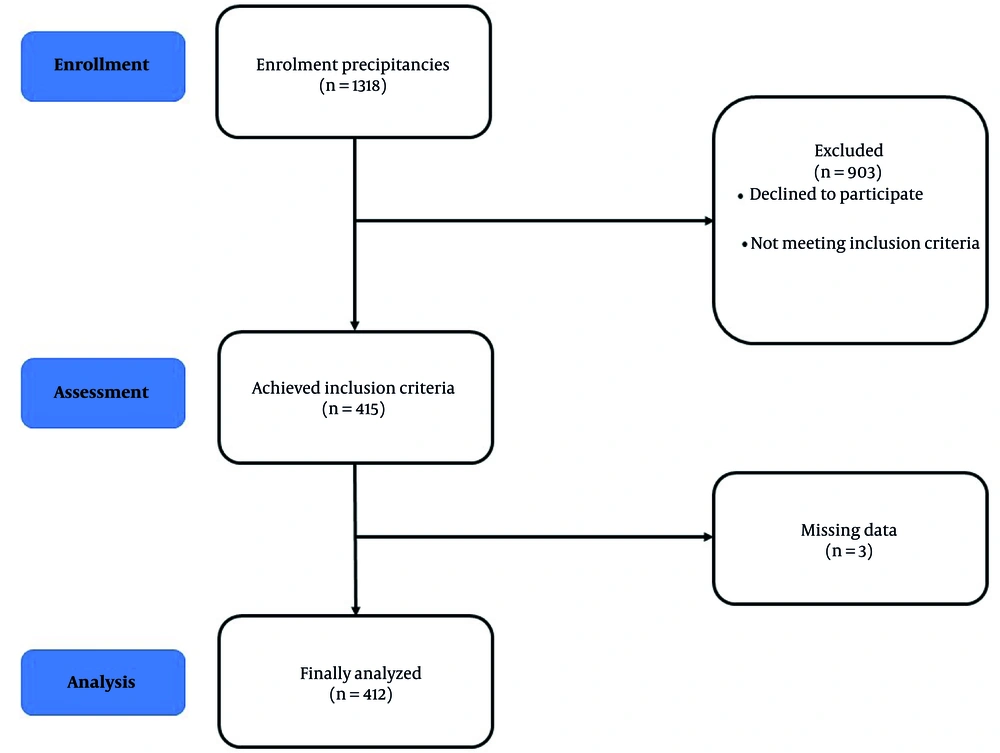 The nutrition interviewer completed a 110-item, semi-quantitative Food Intake Questionnaire to assess the participants' food intake (13). The Food Frequency Questionnaire (FFQ) provided the frequency in ten-option categories (‘seldom/never, once per month, 2 - 3 per month, once per week, 2 - 3 per week, 4 - 6 per week, 1 per day, 2 - 3 per day, 4 - 5 per day, and six or more per day). In addition, participants were asked to record the portion sizes of each food and beverage item. The frequency was converted to daily intake using household measurements, and the portion sizes were changed to grams. The proportion of each food item was converted to grams using the Home Scales Handbook. The Nutritionist 4 program was employed to assess the energy and nutrient intake. The validity and reliability of this questionnaire have been confirmed in Iran through prior research (12).