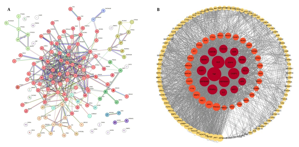 A, protein-protein interaction (PPI) network of targets between Tetramethylpyrazine (TMP) and myocardial ischemia-reperfusion injury (MIRI); B, hub targets ranked with CytoNCA; the red and orange nodes represent targets that exceeded the median of all indicators during the initial screening. Among these nodes, the red nodes denote that the core targets surpassed the median values during the secondary screening; the larger the node in the figure, the greater the degree centrality of the representative target.