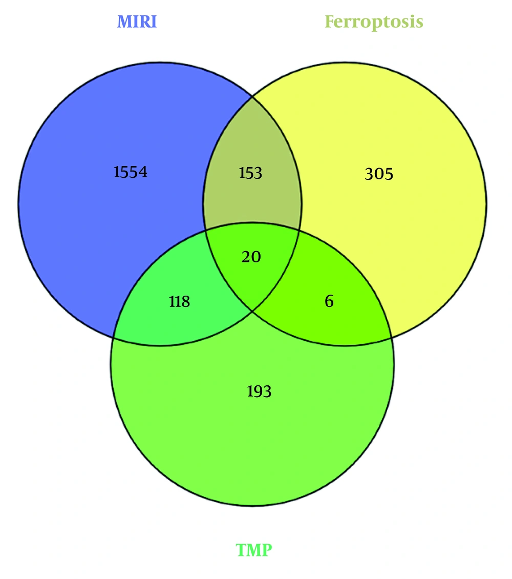 Three different datasets were overlapped to find convergent therapeutic targets. Using Venn diagram visualization, a multidimensional analytical method was used to identify target intersections, which also revealed three binary intersections (TMP-MIRI, TMP-ferroptosis, and MIRI-ferroptosis dyads) and tripartite convergence nodes. These overlapping targets, representing shared molecular mechanisms among the three biological domains, were prioritized for subsequent mechanistic investigations.