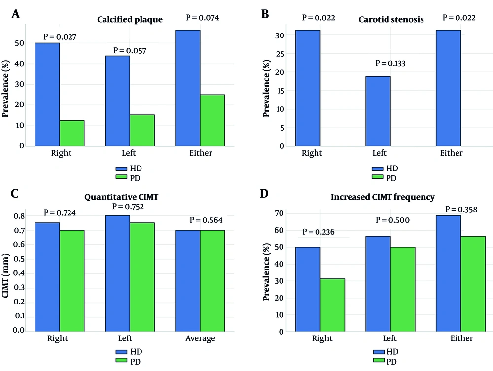 This study provides a comparative evaluation of CAC, carotid artery stenosis, and CIMT in patients undergoing HD versus PD, aiming to elucidate differences in vascular pathology between these two dialysis modalities. Our findings indicate a significantly greater burden of VC and stenosis among HD patients, with calcified plaques present in 50.0% of the right carotid arteries in HD patients compared to 12.5% in PD patients (P = 0.027), and right-sided carotid stenosis exclusively present in HD patients (31.3%, P = 0.022). These findings underscore the heightened vascular risk in HD patients, even in the absence of marked differences in conventional cardiovascular risk factors. These results align with existing literature, which identifies HD patients as being at greater risk for VC compared to their PD counterparts (13, 16-19).
