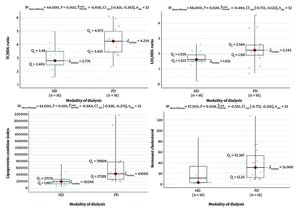 Assessment of laboratory biochemical parameters revealed no statistically significant differences between the HD and PD groups regarding serum levels of calcium, phosphorus, albumin, PTH, vitamin D3, triglycerides, LDL, HDL, or CRP status. Conversely, total serum cholesterol levels were significantly elevated in patients undergoing PD compared to those receiving HD [179 mg/dL (IQR: 151.3 - 204.5) vs. 120 mg/dL (IQR: 95.5 - 148.3), P < 0.001]. All other biomarkers demonstrated comparable distributions across groups. A detailed comparison of biochemical profiles between the two cohorts can be found in Table 1, and Supplementary File, Figure S2 in Supplementary File illustrates the distribution of selected markers.