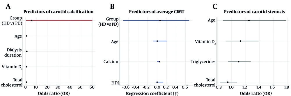 Multivariable regression models identifying predictors of carotid vascular outcomes in dialysis patients: A, forest plot showing odds ratios (OR) and 95% confidence intervals (CI) for independent predictors of carotid artery calcification (CAC) – age emerged as a significant predictor (P = 0.021); B, linear regression coefficients (β) and 95% CIs for average carotid intima-media thickness (CIMT, none of the variables was significant); C, ORs for carotid artery stenosis, with all predictors remaining non-significant. Red markers indicate statistically significant predictors (P < 0.05; abbreviations: HD, hemodialysis; PD, peritoneal dialysis).
