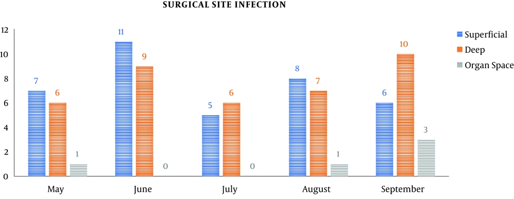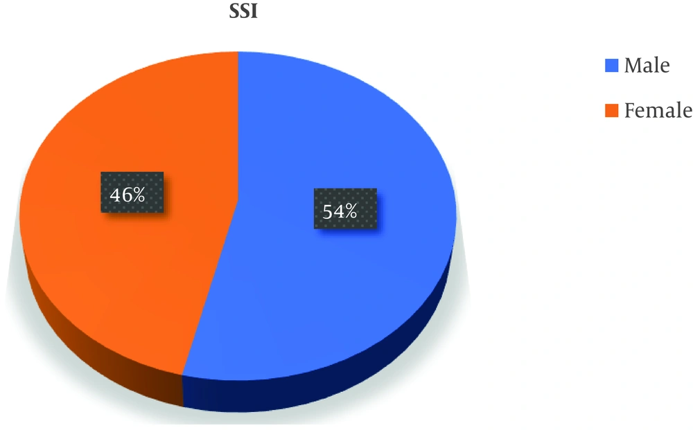The overall incidence of SSI in this 1000-bed tertiary-care hospital was 2.6%, which is comparable to the rates in other studies in other parts of the world and India, i.e., 2.5% to 38.7%. There was a marginal preponderance of male patients (54%) over female patients (46%) developing SSI. In some studies, female preponderance was reported, but sex is not a pre-determinant factor towards the risk of SSI. The highest incidence was observed in the 51 - 60 years’ age group. Studies have reported that the increasing age independently predicted an increased risk of SSI until the age of 65 years, while at ages ≥ 65 years, the increasing age independently predicted a decreased risk of SSI. The average duration of surgery was 4.5 hours among patients who developed SSI. Prolonged operation time, increased exposure to the operation theater air, prolonged anesthesia, prolonged trauma, and sometimes, excessive blood loss can increase the risk of SSI. Certain conditions like hyperglycemia and hypertension predispose an individual to SSI according to various studies (14-17).