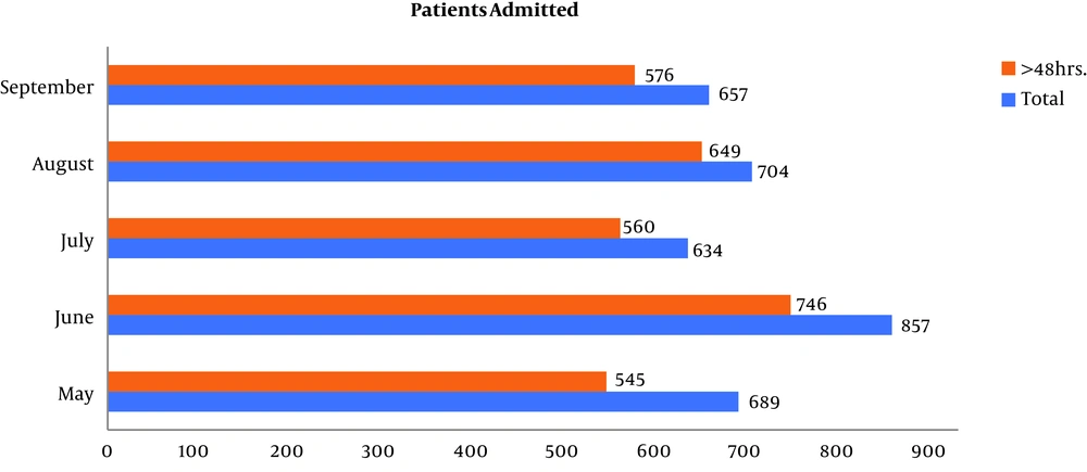 The analysis was done on the data of 3,541 patients admitted to both Gynecology-Obstetrics Ward and General-Surgical Ward of the hospital between 1, May 2018 and 30, September 2018 who underwent surgical interventions. Of them, 3,076 (86.87%, 95% Confidence Interval (95% CI): 85.7% to 87.96%) patients stayed in the hospital for more than 48 hours (Figure 1).