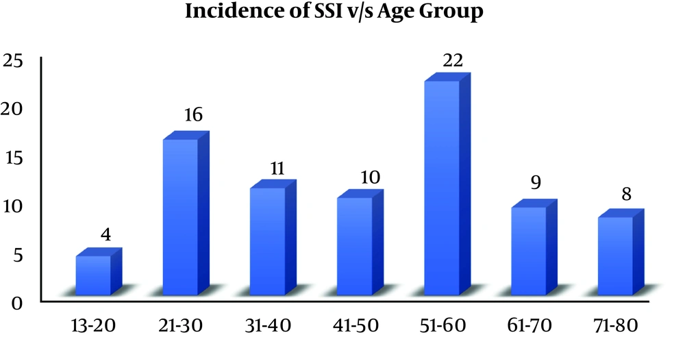 The overall rate of SSI was 80/3541 (2.26%, 95% CI: 1.81% to 2.82%). The highest incidence of SSI was noted in 51 - 60 years of age as 22/80 (27.5%, 95% CI: 18.4 to 38.8%) (Figure 3), while the lowest incidence was found in the age group of 13 - 20 years as 4/80 (5%, 95% CI: 1.6% to 12.9%).