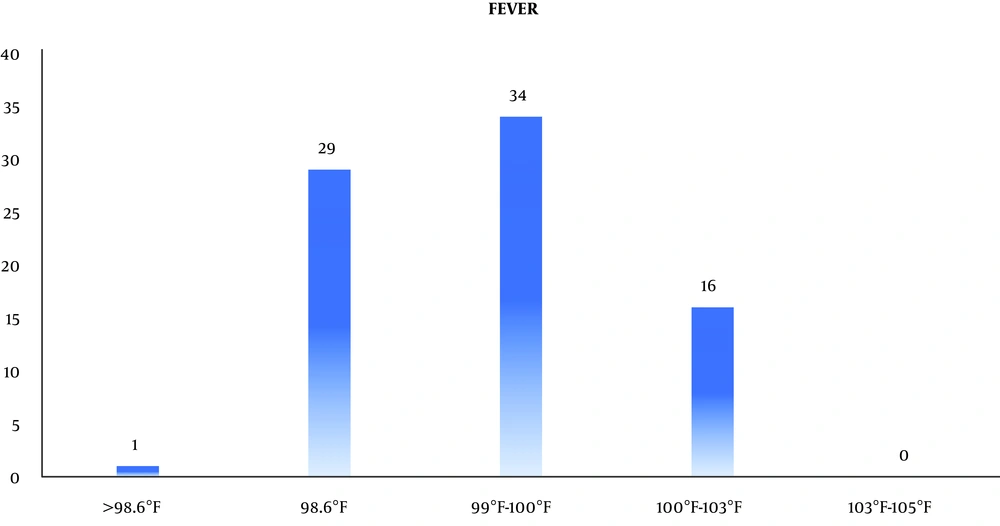 The mean duration of surgery was 4.5 hours. Besides, 23/80 (28.75%, 95% CI: 19.45% to 40.12%) patients had comorbidities such as diabetes mellitus [19/80 (23.75%, 95% CI: 15.25% to 34.81%)] and hypertension [15/80 (18.75%, 95% CI: 11.21% to 29.35%)]. Moreover, 34/80 (42.5%, 95% CI: 31.68% to 54.05%) patients presented with mild fever while 16/80 (20%, 95% CI: 12.2% to 30.74%) patients presented with body temperature between 100°F and 103°F. However, 29/80 (36.75, 95% CI: 26.01% to 47.82%) patients did not show any rise in temperature (Figure 4).