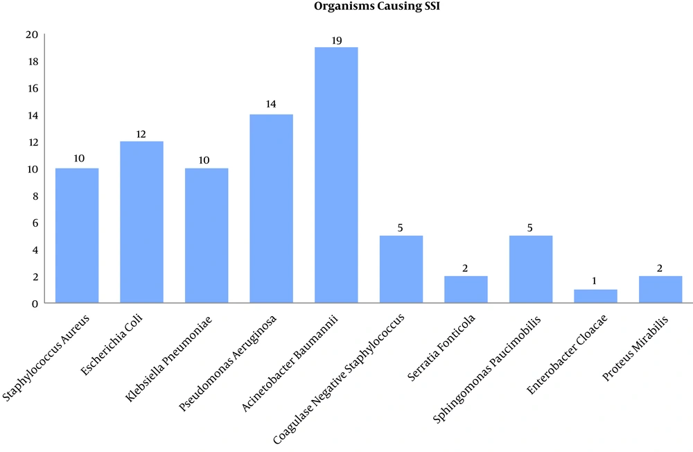 Gram-negative bacilli were predominant causes of SSI, with Acinetobacter baumannii at the rate of 19/80 (23.75%), followed by Pseudomonas aeruginosa with the rate of 14/80 (17.5%). This trend of gram-negative bacilli dominating gram-positive cocci has been observed in other studies (18-21). Acinetobacter species are oxidase-negative, opportunistic pathogens that have emerged as major causes of SSI in this setting. Acinetobacter has also been isolated from food (including hospital food), suctioning equipment, infusion pumps, sinks, pillows, mattresses, ventilator equipment, tap water, bed rails, stainless steel trolleys, humidifiers, soap dispensers, and other sources (22, 23).