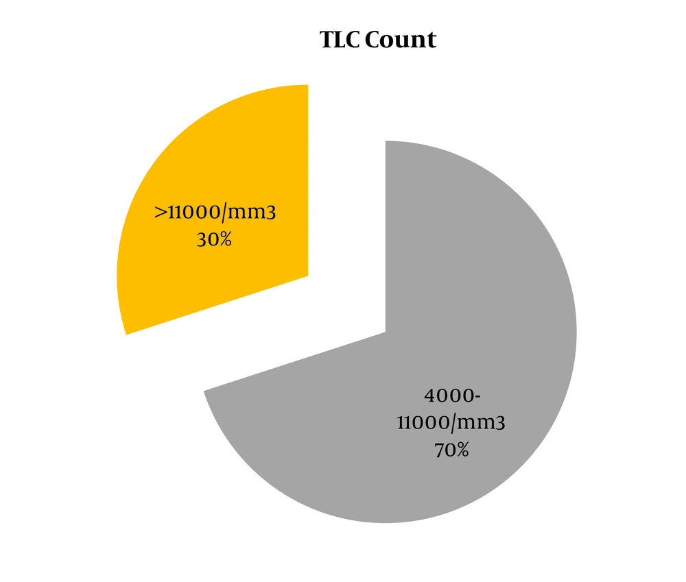 The WBC count was raised in 24/80 (30%, 95% CI: 20.52% to 41.42%) patients (Figure 5).