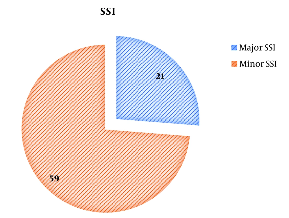 Moreover, 21/80 (26.25%, 95% CI: 17.33 to 37.48%) patients had pyrexia, increased leukocyte count, and tachycardia, thus falling under major SSI while remaining 59/80 (73.75%, 95% CI: 62.52 to 82.67) patients developed minor SSI (Figure 6).