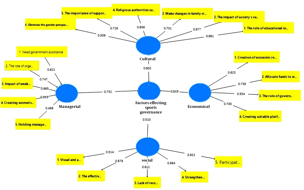 The results of Table 5 indicated the impact of each factor in the social, economic, management, and cultural variables on the aforementioned elements. In the cultural variable, the impact of social beliefs and values on women’s participation in sports was at the correlation rate of 87%. In the management variable, the factor of granting management positions to women in sports was at the correlation rate of 85%. In the economic variable, the factor of allocating budget to women’s sports was at the correlation rate of 73%. In the social variable, the factor of participation of the Ministry of Health and Ministry of Sports in creating sports events to develop women’s health in the provinces of Iran was reportedly at 92%, with the highest correlation impact rate.