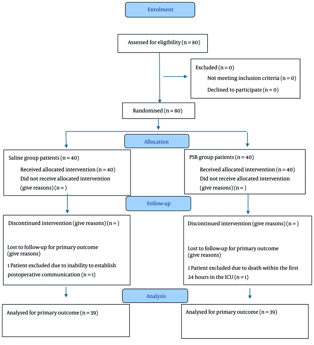 During follow-up, one patient from each group was excluded from the final analysis. In the saline group, one patient was excluded due to the inability to establish postoperative communication, which precluded assessment of the primary outcome. In the PSB group, one patient died within the first 24 hours in the intensive care unit (ICU) and was therefore excluded.