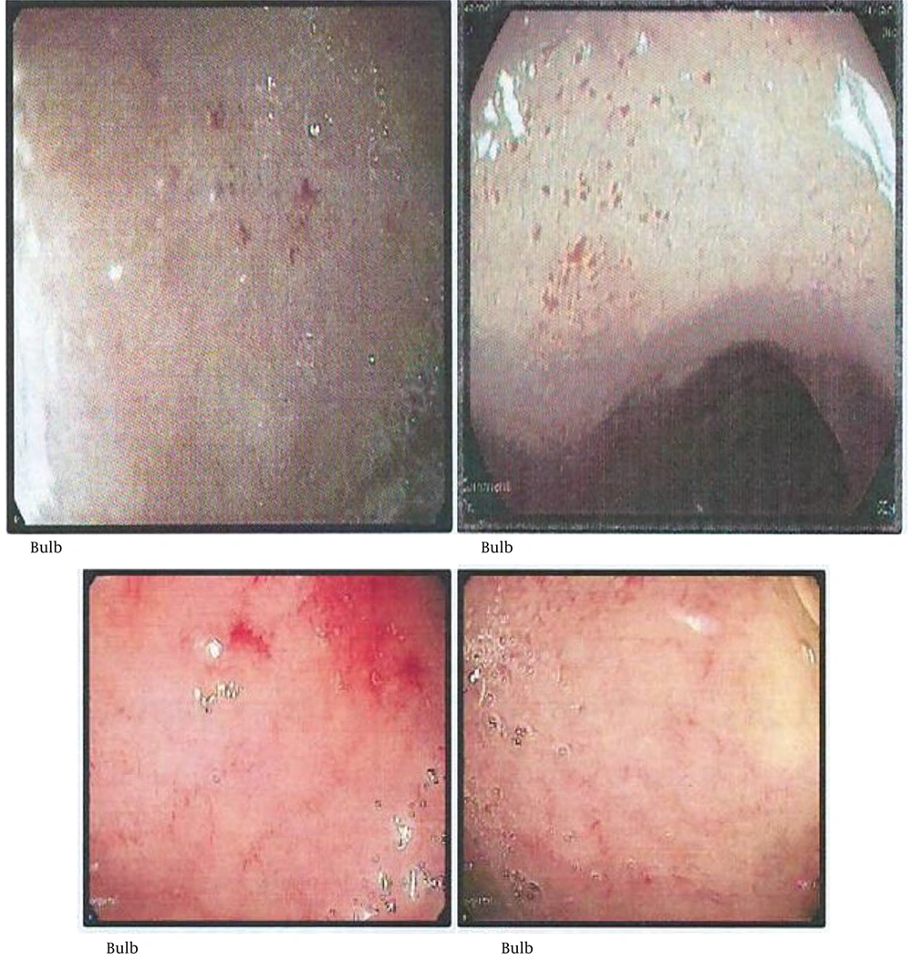 Endoscopic findings in celiac disease primarily appear in the distal duodenum and often include nodular mucosa, either with or without a mosaic pattern, absent or flattened Kerkring’s folds, mucosal erosions, visible submucosal vascularity, and deep mucosal grooves (1-5). These findings are indicative of villous atrophy and have a high specificity (> 90%) for celiac disease in regions where it is the most prevalent cause of villous atrophy. The sensitivity of these endoscopic signs has been reported to range from 40% to 70% in patients with this condition (8). Small, red spot lesions (RSLs) that do not damage the surrounding mucosa have been identified (1). However, research exploring the relationship between RSLs and celiac disease remains limited.
