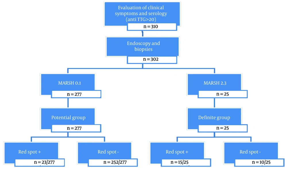The present diagnostic study was conducted over 36 months on children under 18 years old at Mofid Children’s Hospital, a tertiary hospital for pediatric patients in Tehran, Iran, from March 2019 to February 2022. These patients, who were candidates for duodenal biopsy and esophagogastroduodenoscopy, were selected based on clinical presentations and serologic results indicative of celiac disease. Initially, after obtaining informed consent, a pre-prepared checklist was completed for each patient, including details such as age, gender, height, weight, Body Mass Index (BMI), weight-for-height Z-score, clinical manifestations (chronic diarrhea, chronic abdominal pain, vomiting, nausea, anorexia, constipation, abdominal distention, steatorrhea, anemia, and skin lesions), comorbidities (type 1 diabetes, thyroiditis, hypothyroidism, autoimmune liver dysfunction, Down syndrome, and Turner syndrome), and results of serologic tests (anti-tTG IgA, total IgA).