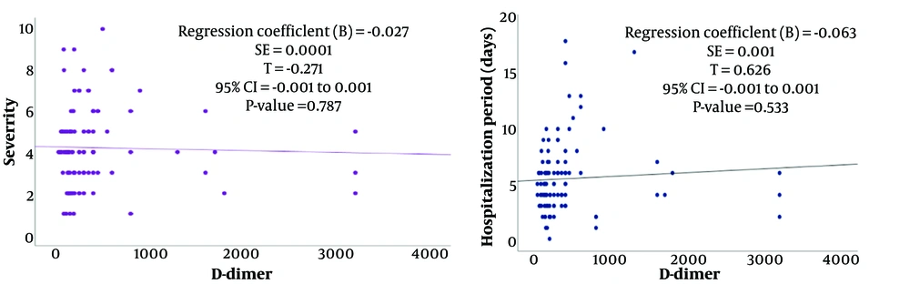 Notably, no mortality was reported among the study participants. The investigation revealed a very weak correlation between serum D-dimer levels and the clinical severity of bronchiolitis in children, which was not statistically significant (P > 0.05). Similarly, a weak positive correlation was observed between serum D-dimer levels and the length of hospital stay, but this association also lacked statistical significance (P > 0.05) (Figure 1). Logistic regression analysis further evaluated the relationship between serum D-dimer levels and the need for PICU admission, and no statistically significant association was found (P = 0.480).