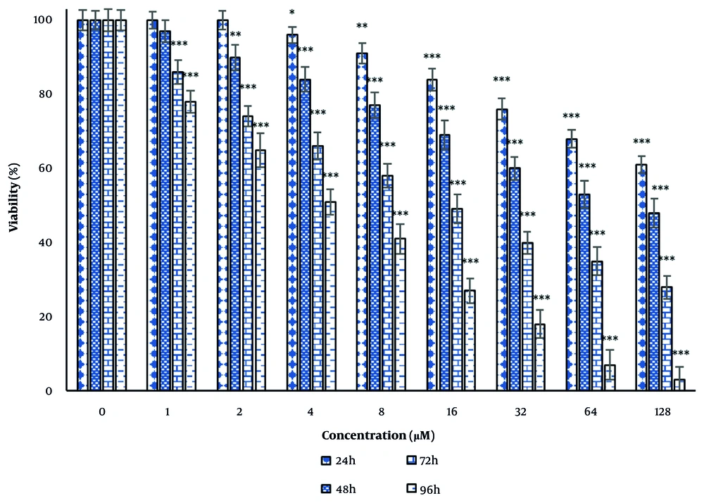 ![The effect of andrographolide on the viability of thyroid cancer cells. Cell viability was evaluated after 24, 48, 72 and 96 h of treatment by [3-(4,5-dimethylthiazol-2-yl)-2,5-diphenyl-2H-tetrazolium bromide] (MTT) assay. The cells of the control group received the same volume of medium without drugs (*P < 0.05, **P < 0.01, and ***P < 0.001 compared to the control). The effect of andrographolide on the viability of thyroid cancer cells. Cell viability was evaluated after 24, 48, 72 and 96 h of treatment by [3-(4,5-dimethylthiazol-2-yl)-2,5-diphenyl-2H-tetrazolium bromide] (MTT) assay. The cells of the control group received the same volume of medium without drugs (*P < 0.05, **P < 0.01, and ***P < 0.001 compared to the control).](https://services.brieflands.com/cdn/serve/3170c/bc51880bbc59a937ba78fcb32dba5b9d98c7111c/jcrps-14-2-161678-i001-preview.webp)