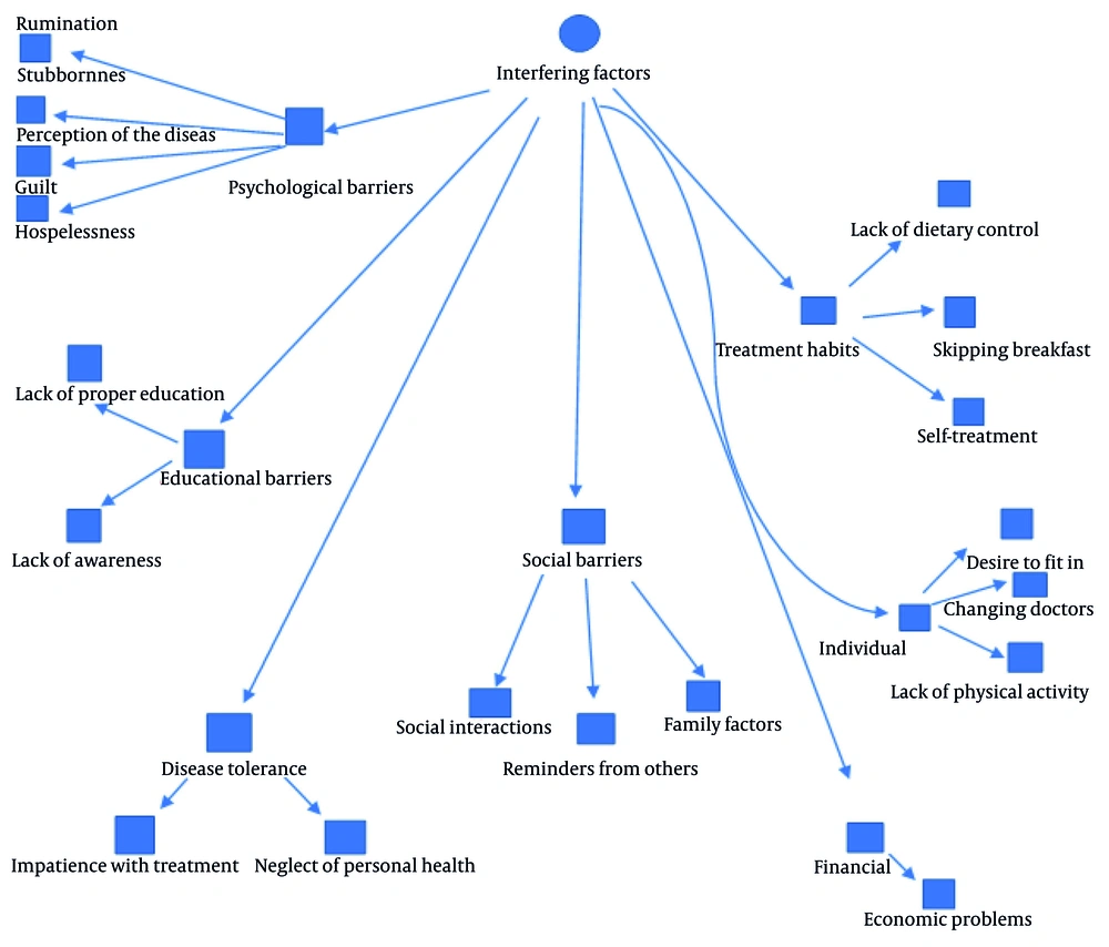 Based on the hierarchical diagram of interfering factors in the self-care model, seven core codes were identified: Psychological barriers, including secondary codes such as guilt, perception of the disease, hopelessness, and stubbornness; educational barriers, comprising secondary codes like lack of proper education and lack of awareness; disease tolerance, with secondary codes such as impatience with continuing treatment and neglect of personal health; social barriers, including secondary codes like family factors, reminders from others, and social interactions; financial barriers, with secondary codes such as socio-economic problems; individual barriers, consisting of secondary codes like changing doctors, the desire to fit in, and lack of physical activity; and treatment and dietary habits, formed by secondary codes such as lack of dietary control, skipping breakfast, and self-treatment. The barriers to self-care are presented in Figure 1.