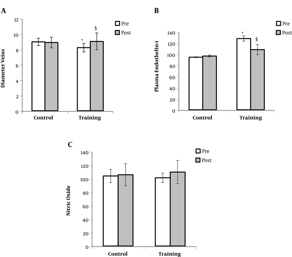 The results of intra-group analysis in circuit resistance training group showed that, compared to the pre-test, exercise significantly increased vascular diameter (P = 0.021), and decreased endothelin-1 (P < 0.001), and systolic blood pressure (P < 0.001); however, it has no significant effect on plasma concentration of nitric oxide, diastolic blood pressure and heart rate (P < 0.05) (Table 1 and Figure 1).
