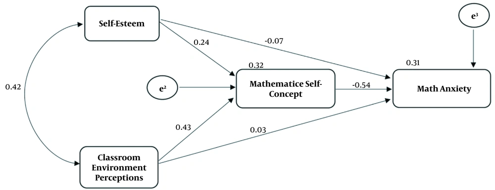 The emergence of MA may be attributed to several factors, including poor self-concept, poor skills, school refusal, teachers’ attitude, and emphasis on teaching math through traditional methods and math comprehension through excessive practice and homework (7). The present study aimed to assess the impact of psychological and environmental factors on MA. Self-esteem is considered to be a significant influential factor in this regard. Self-esteem is a psychological construct that has drawn the attention of numerous psychologists and researchers in recent decades. In general, the self-evaluations of an individual shape their self-esteem (8). Self-esteem may be defined as the degree to which individuals approve of, accept, and value themselves (9). According to Harris et al. (10), self-esteem is attained in interpersonal relationships and is a reflection of others’ views toward a person, which determines the way an individual deals with different issues. Self-esteem also shows one’s self-worth as an individual (11). Rajabi et al. (12) stated that self-esteem and context-independent cognitive style have a significant, negative association with the MA of female students. In addition, Xai et al. (13) reported a significant, negative association between self-esteem and MA, as well as a significant, positive association between test anxiety and MA in male and female students.