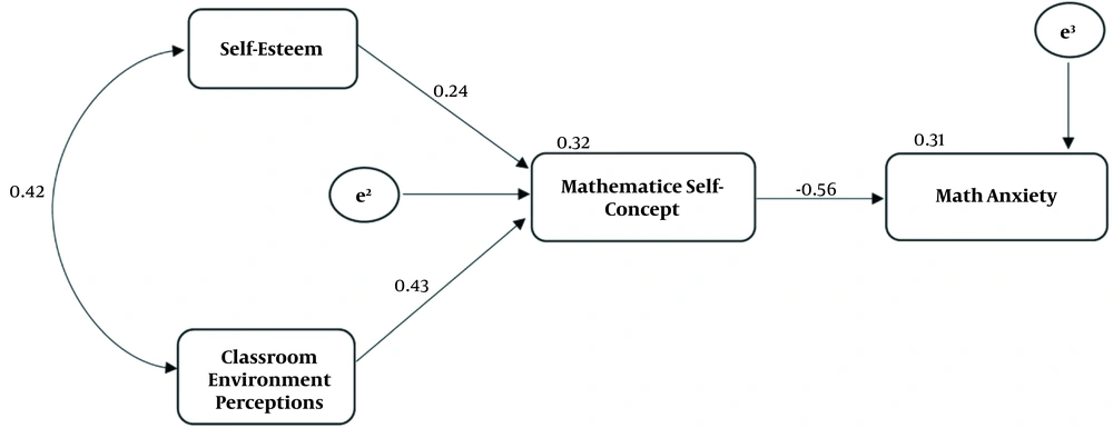 Another finding of the present study showed a direct, negative association between the students’ MSC and MA, and their improved MSC was expected to decrease their MA level. This is consistent with the results obtained Ghadampour et al. (27) and Aligholipoor et al. (28). In general, MSC shows the beliefs/perceptions of one’s ability to solve a math problem, which helps with the efficient solving of the math problem (35). Individuals with high self-efficacy oversee the thought and regulation of their individuals, control commitments and problems, and engage in more threatening and challenging situations. They also see problems as challenges rather than threats and actively seek new opportunities (22). Furthermore, those with high MSC can engage in more challenging matters. Through curiosity, they seek appropriate solutions to their problems and show more perseverance in solving their educational problems; as a result, they experience less MA (36). A significant association has been reported between mathematics self-efficacy (MSE) and the use of cognitive strategies. Therefore, it could be concluded that promoting self-efficacy and self-concept beliefs increase the use of cognitive strategies, thereby enhancing performance and reducing MA (37). MSE and MSC beliefs prove effective through insistence on doing homework, using cognitive and metacognitive strategies, self-organization, and perseverance in the face of difficulties.