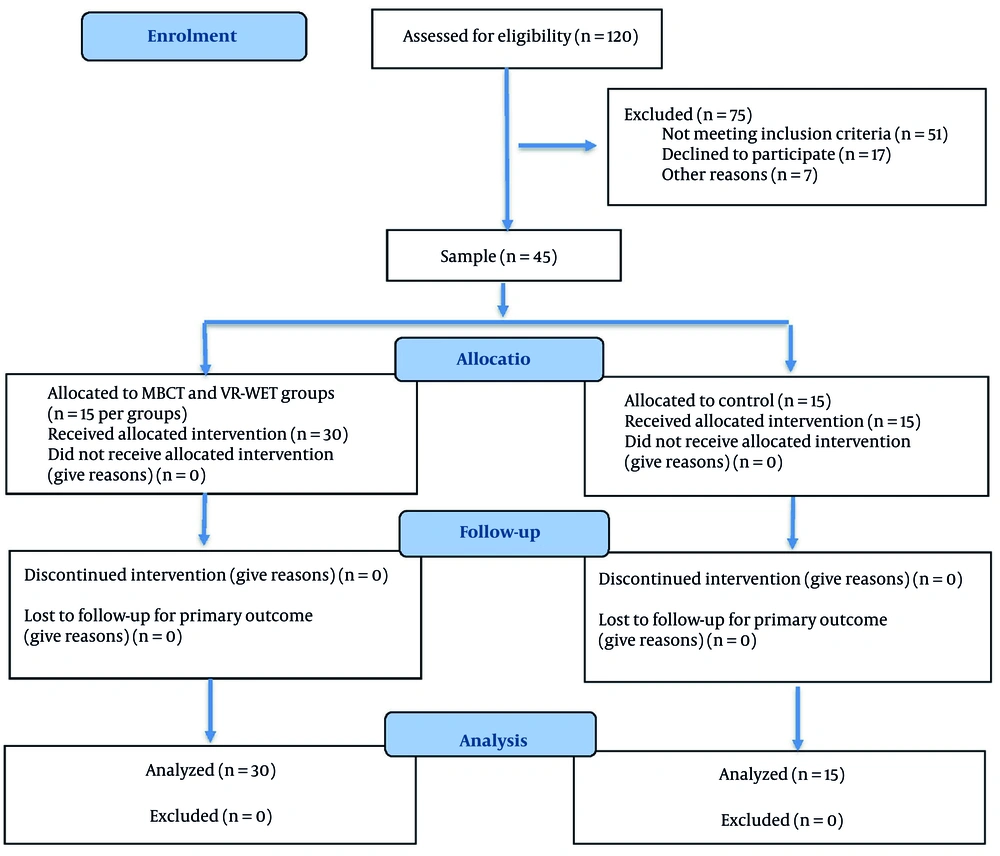 This randomized controlled trial utilized a clinical trial design with pre-test, post-test, and three-month follow-up assessments, including a waiting-list control group. The statistical population consisted of all adolescents (aged 15 - 18 years) diagnosed with SAD who were referred to specialized counseling centers in Ahvaz during the year 2024. Participants were recruited via referrals from school counselors and pediatric clinics, with initial screening of 120 adolescents; eligibility assessments yielded 75 candidates, of whom 45 met criteria and were enrolled (Figure 1). A purposive sample of 45 adolescents was selected from this population. Inclusion criteria for participation were: A definitive diagnosis of SAD confirmed by the Structured Clinical Interview for DSM-5 (SCID-5) (based on DSM-5 criteria) conducted by a licensed psychologist, and achieving a minimum score of ≥ 50 on the Social Anxiety Scale. Exclusion criteria included the presence of comorbid major clinical disorders (e.g., severe depression, psychotic disorders), any chronic physical or neurological illness, concurrent participation in other psychological treatments, or absence from more than two treatment sessions. Sample size was justified via a priori power analysis using G*Power software (version 3.1), which indicated that n = 15 per group provided 80% power (α = 0.05, two-tailed) to detect medium effect sizes (f = 0.25) in repeated measures analysis of variance (ANOVA) for the primary interaction term. The selected participants were randomly assigned to one of three groups (n = 15 each): The MBCT group, the VR-WET group, and the waiting-list control group, using computer-generated random numbers stratified by age and gender; allocation was concealed via sequentially numbered, sealed opaque envelopes opened only at enrollment. All participants and their legal guardians provided written informed consent, and all ethical considerations were approved by the university’s institutional ethics committee.