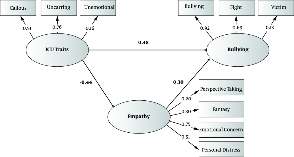 The fourth hypothesis suggested that bullying is coordinated with the mediator of empathy and with the data obtained based on callous-unemotional traits. Calculating the fit indices of the measurement model attributed a desired level of fit to this model, and empathy can therefore play the role of a mediator between these two variables. This hypothesis can be explained by the fact that callous children do not empathize with their victims, and do not feel regretful for their bullying behaviors (33). Given the obtained results and that callous-unemotional traits and empathy are respectively associated with the effective factors in bullying directly and indirectly, the organizations involved are recommended to take the necessary measures and instruments, including holding workshops and providing training packages, to enhance empathy and reduce the incidence of bullying behaviors.