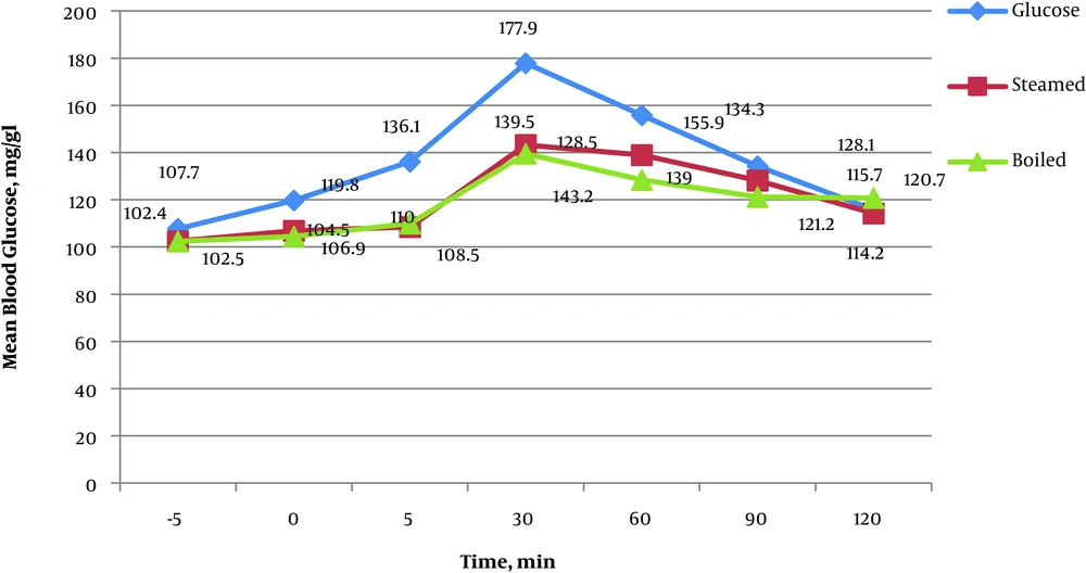 The present study was conducted to determine the GI of Kalat rice cooked through boiling and steaming. Determining the GI of different types of rice and the effect of processing methods on this index (3, 8) is crucial given the growing prevalence of obesity and chronic diseases in urban areas and the contribution of the carbohydrate content of foods, denoted as GI, to some of these diseases, including diabetes, cancer and cardiovascular problems, as reflected in literature. Rice is the main source of carbohydrates in many parts of Iran, and there are different types of rice with different GIs in this country (6). Besides, research suggest that not only the GI of different types of rice differ from each other, cooking methods also affect the GI of rice (9, 10). Determining the GI of all types of rice is therefore essential for selecting the appropriate types, especially for individuals at risk for developing the chronic diseases cited along with determining the effect of cooking method on it.