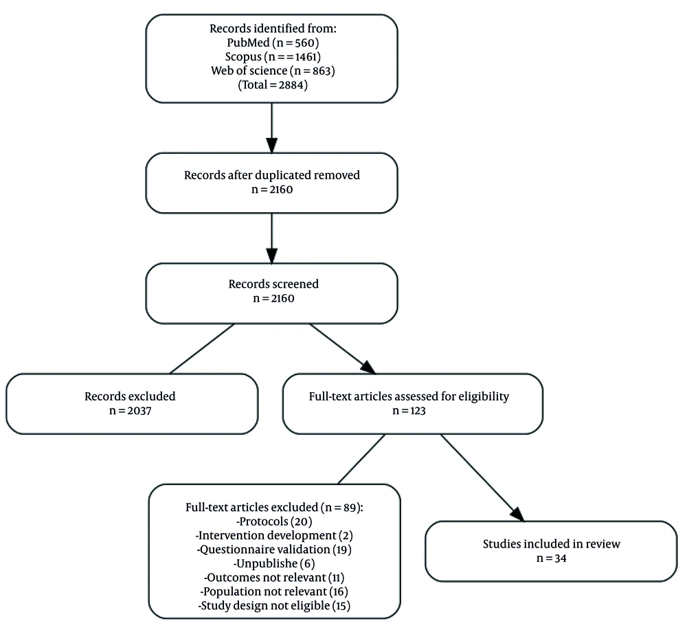 A total of 34 interventional studies met the inclusion criteria and were included in this systematic review. Most interventions were conducted in the adolescent age group (13 - 17 years) and in combined age groups of 8 - 18 years. Six studies (17.6%) focused specifically on adolescents aged 13 - 17 years (14, 17, 20, 21, 29, 36), and ten studies (29.4%) targeted combined age groups of 8 - 18 years (9, 11, 13, 15, 18, 25, 26, 30, 38, 40). Fewer studies were conducted in younger children (6 - 12 years) or broader age ranges (12, 19). All included studies met the inclusion criteria of 5 - 19 years (Table 2).